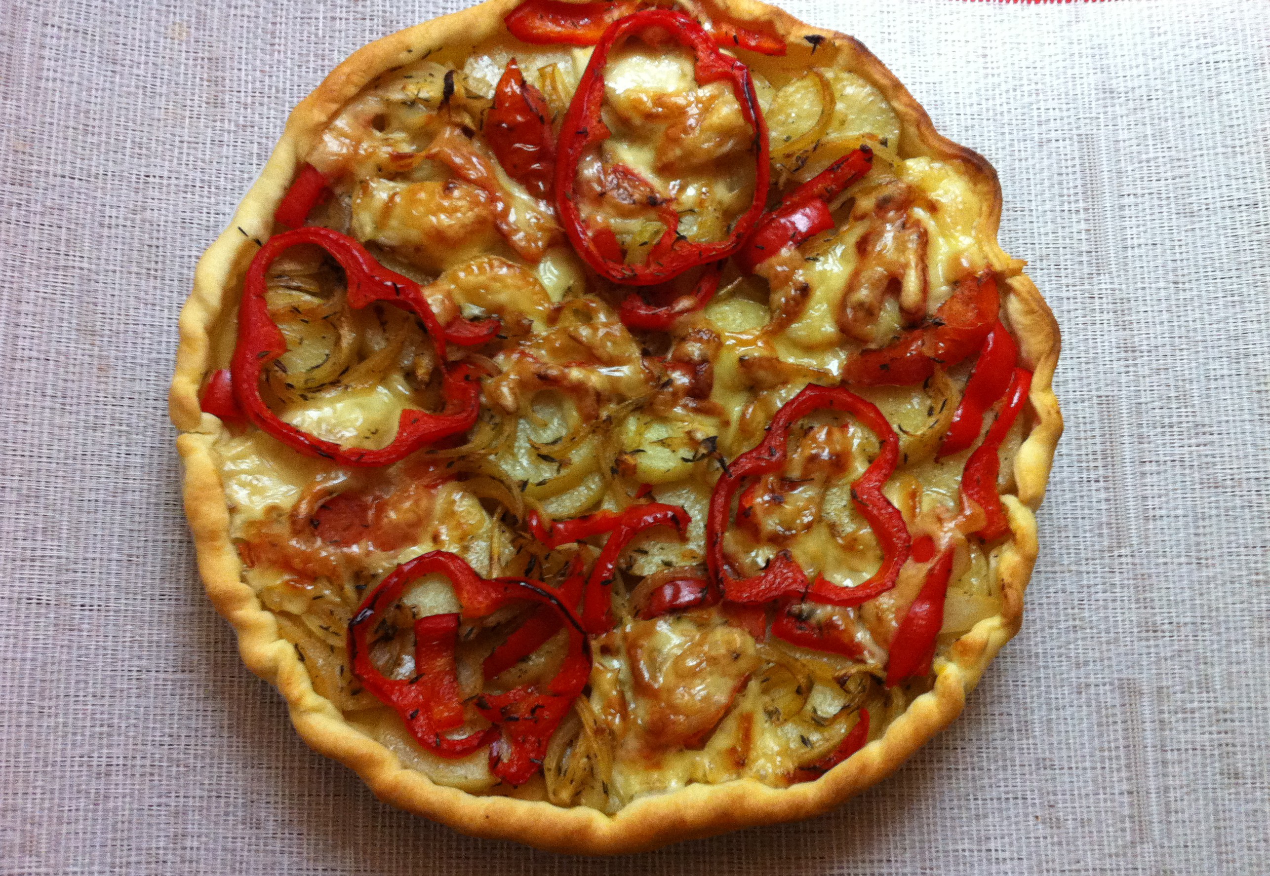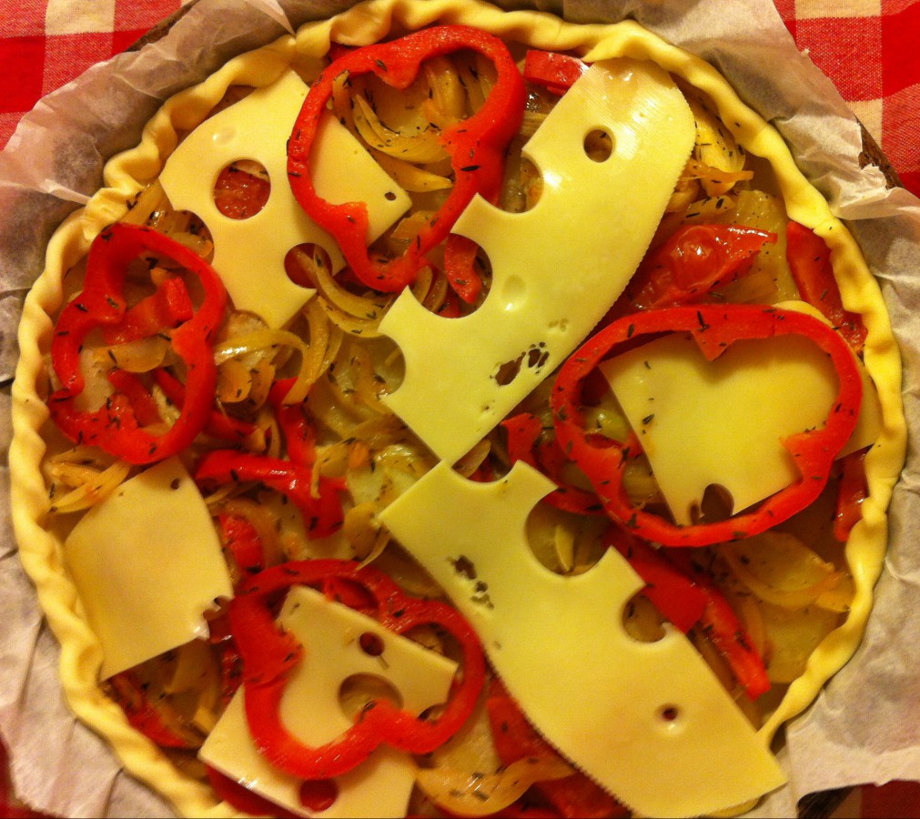 3. Sortez la pâte feuilletée et mettez-la dans un moule à tartre. Piquez le fond avec une fourchette et mettre une première couche avec les pommes de terre. Rajoutez ensuite tous les légumes et les 4 rondelles de poivron par dessus. Terminez avec les lamelles de fromage.