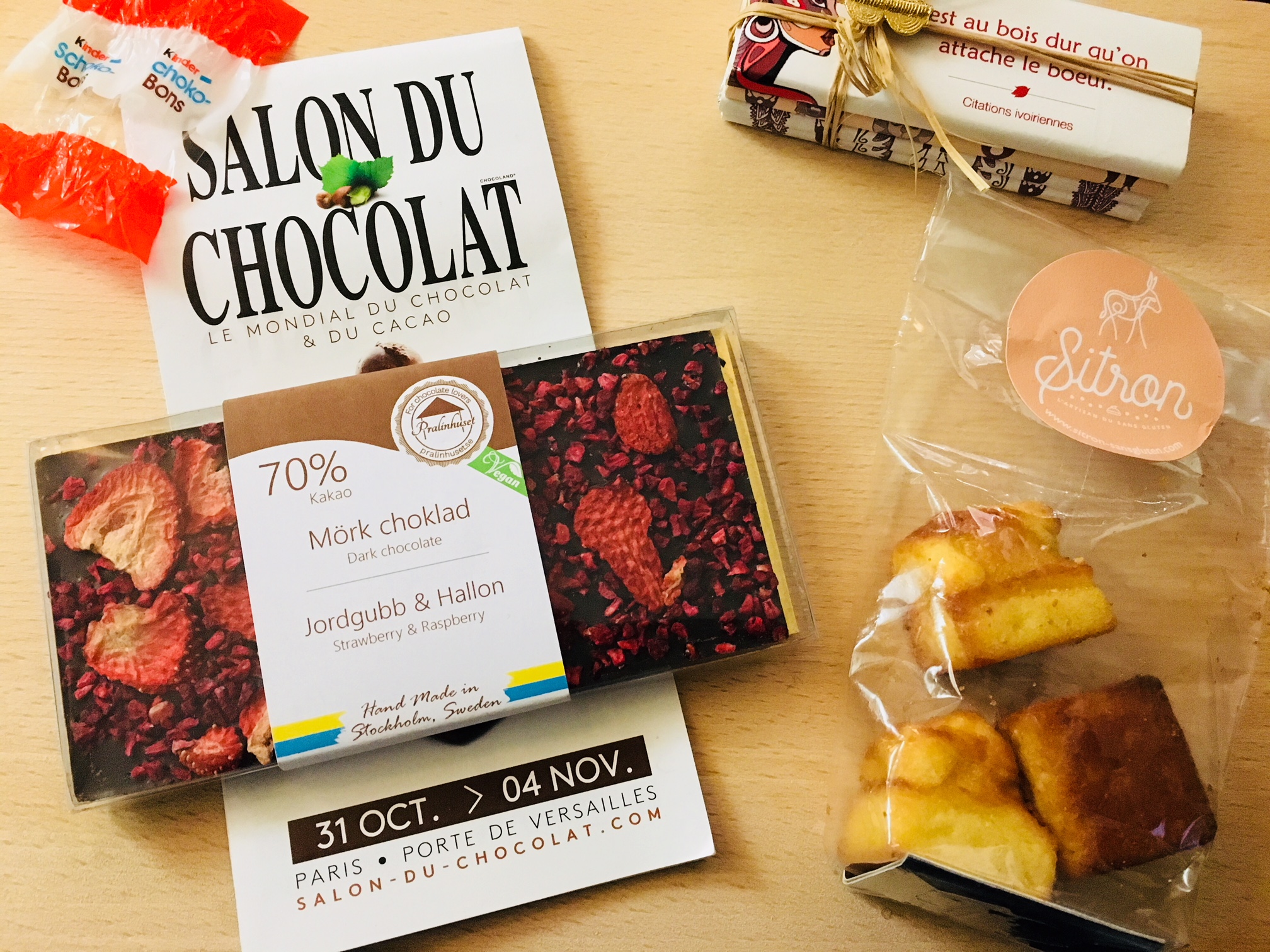 En souvenir de cette belle journée, j’ai acheté des chocolats made in Suède à la fraise et framboise, des chocolats made in Côte d’ivoire des douceurs de Suzanne, des madeleines sans lactose et sans gluten de la boulangerie Sitron sans gluten.