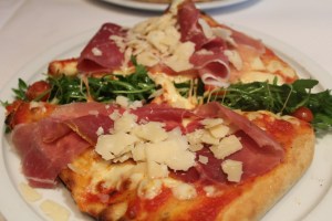 Pizza au jambon sec, fromage et roquette