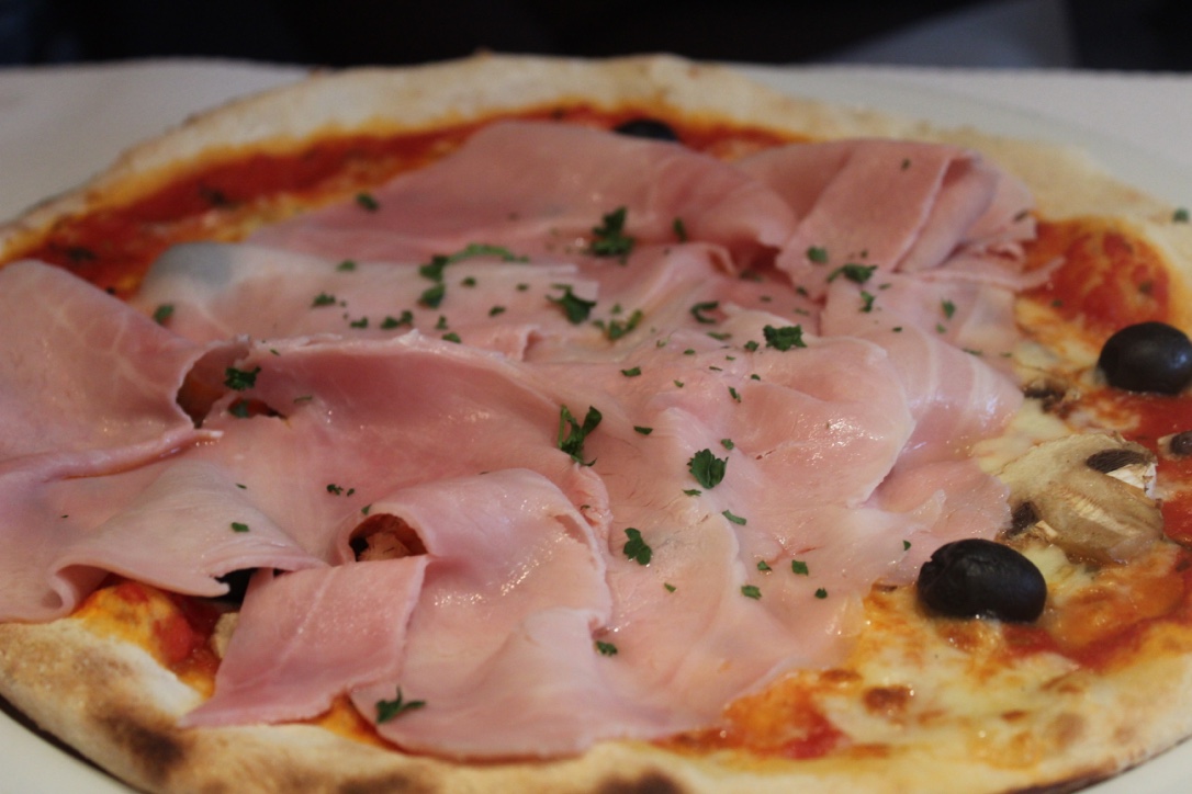 Avant de nous donner la carte, le propriétaire nous explique que tous les produits utilisés sont frais, bios et préparés chaque jour ^_^. La carte est très variée, avec des plats qui ont l’air d’être tous très savoureux. Finalement, ce sera des pizzas, deux aux jambons et une aux légumes.