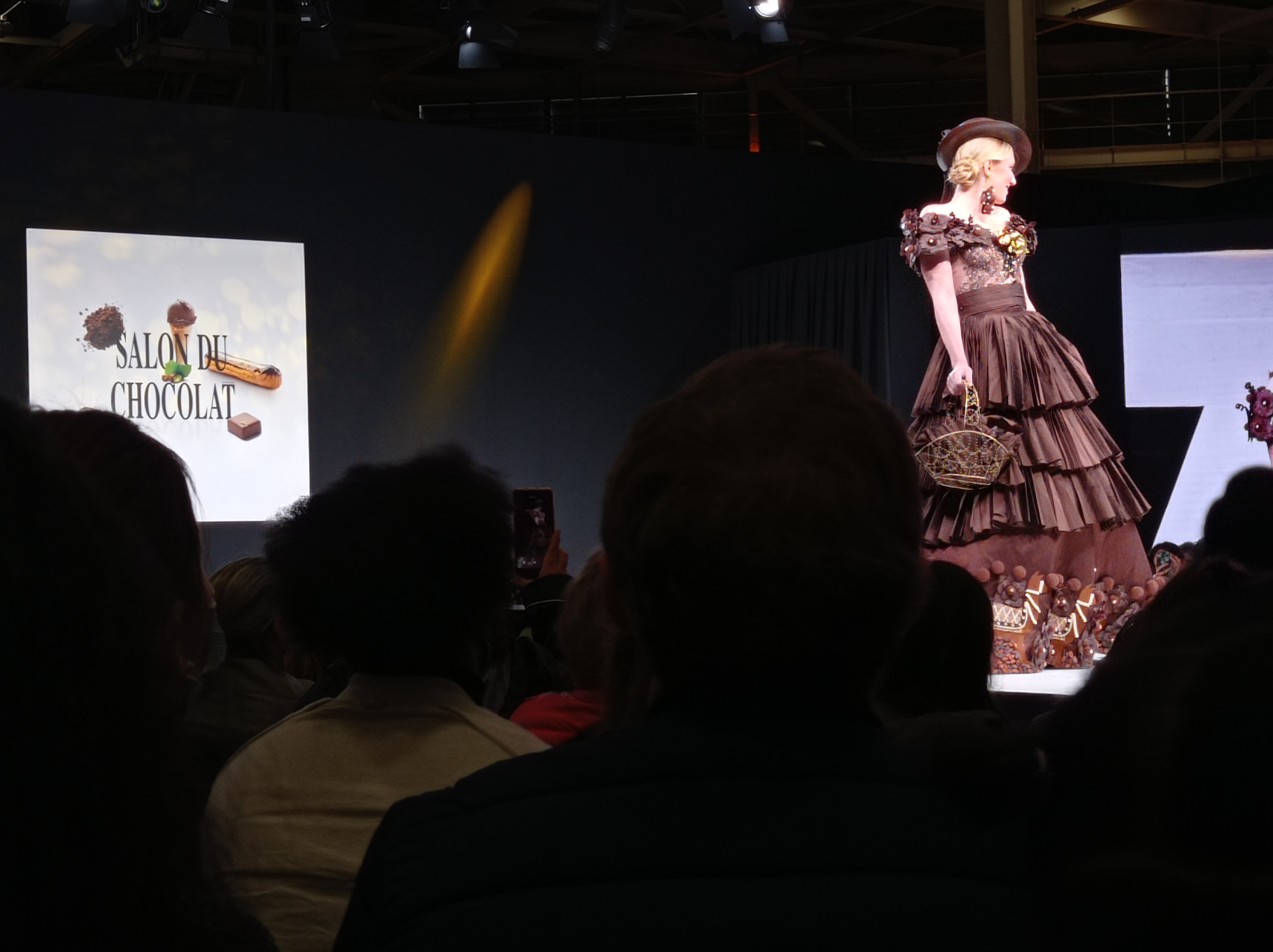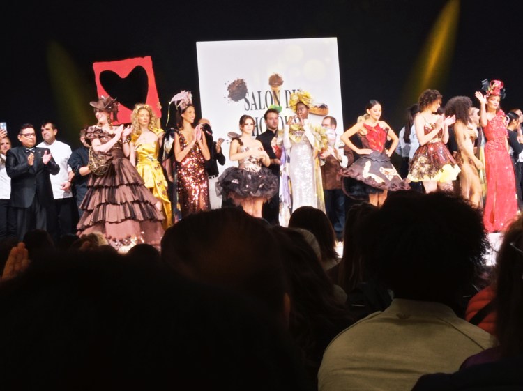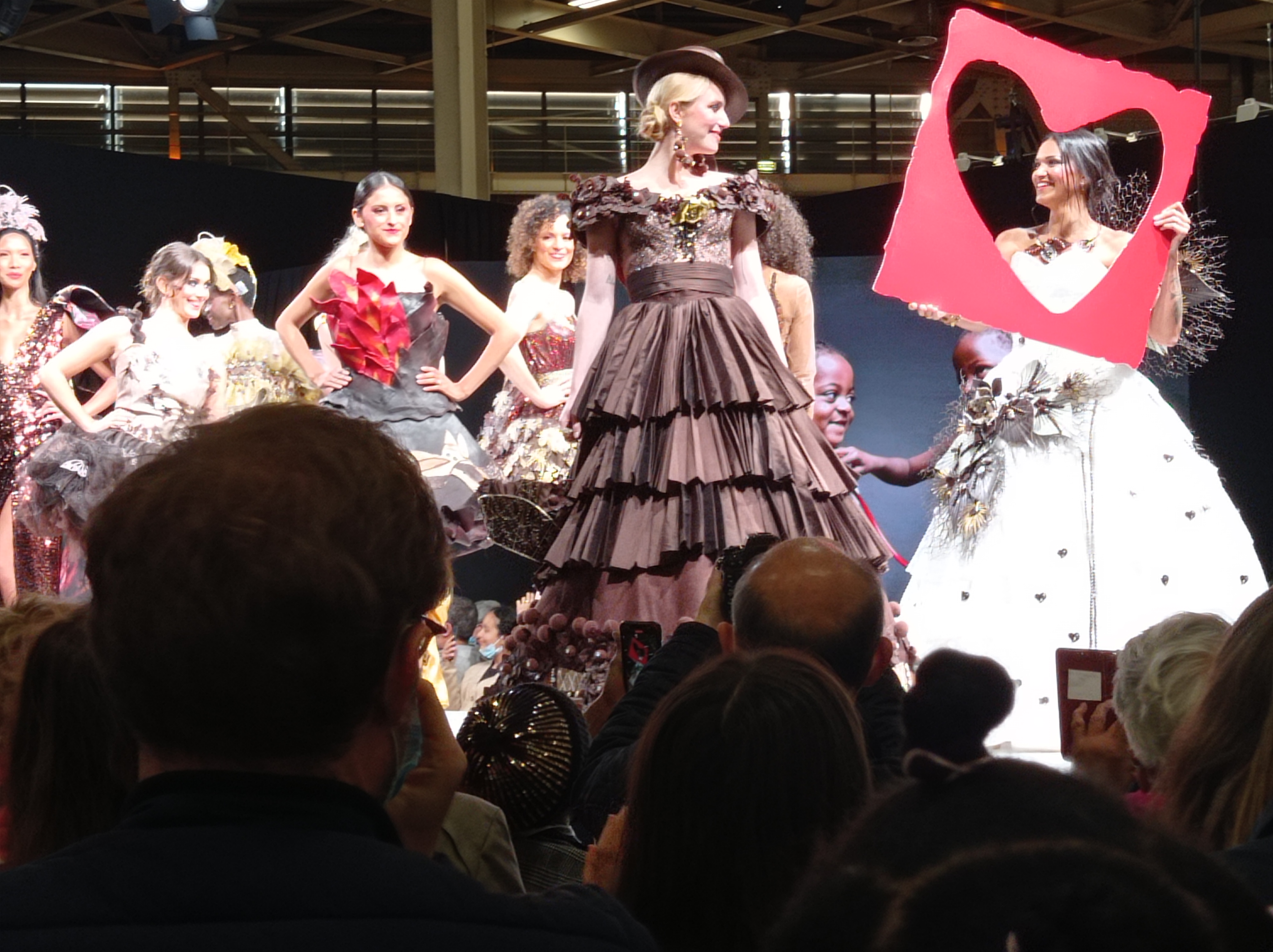Cette année, le défilé est en faveur de l’association Mécénat chirurgie cardiaque. C’est l’apothéose, qui est attendue par beaucoup de visiteurs durant la journée. La 1ère fois que j’y ai assisté, j’étais émerveillée. Je n’aurais jamais pensé, que le chocolat pouvait être associé à la mode. Eh bien oui !! Le thème retenu cette année est la « renaissance ». Les créateurs ont fait preuve de créativité, comme chaque année. En effet, chaque créateur collabore avec un pâtissier pour concevoir la robe. Résultat, les robes étaient toutes magnifiques et gourmandes. Beau défilé 😉.